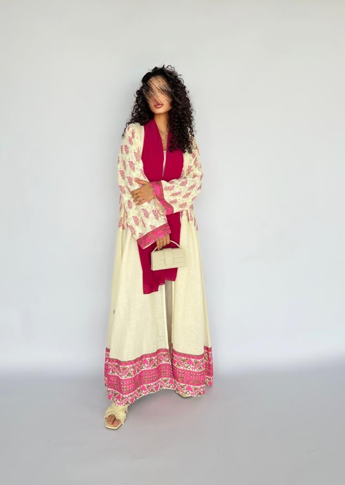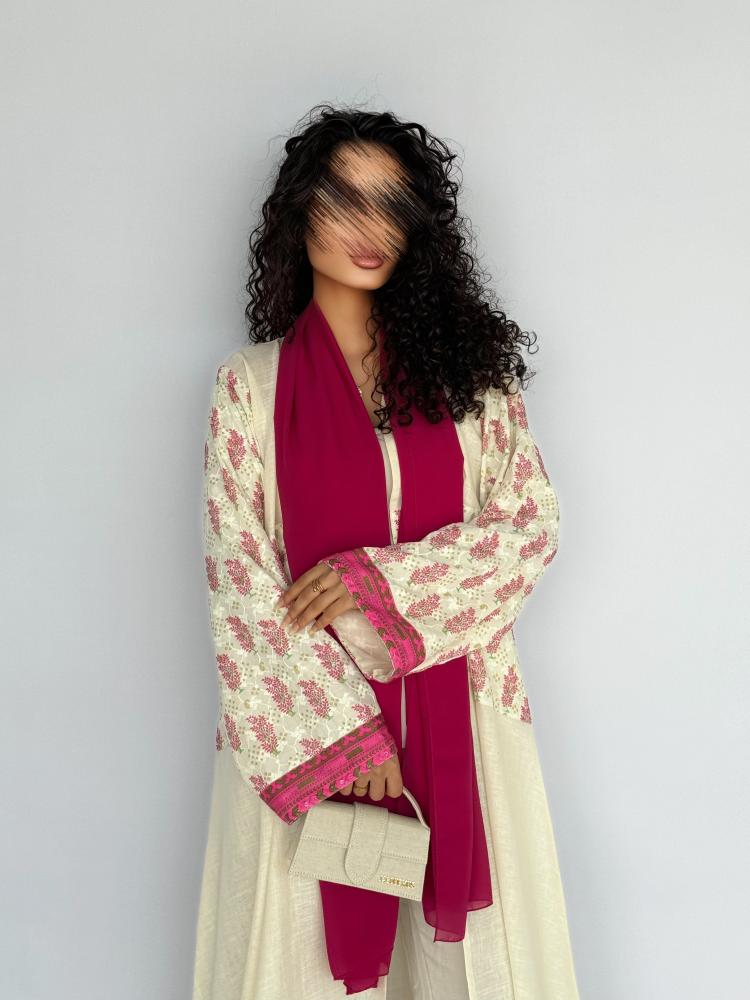 #Lantana🌷القماش: لنن سكري+ تدخيله مزخرف بالوردي الفوشيالقصه: كلوشاللون: سكري ساده وتدخيله وردي فوشي