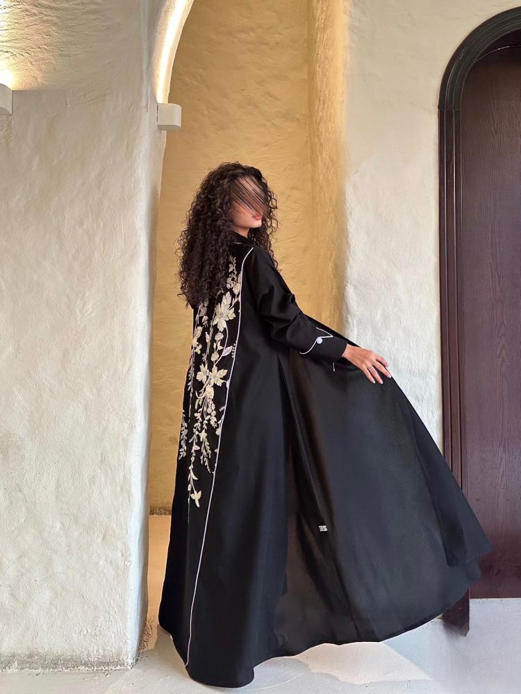 #SalviaRose🌷السعر: ٣٨٠ ريالالقماش: كريب + كريب مطرزالقصه: نص كلوشاللون: اسود+تطريز بيج و بنفسجي و تفاحي